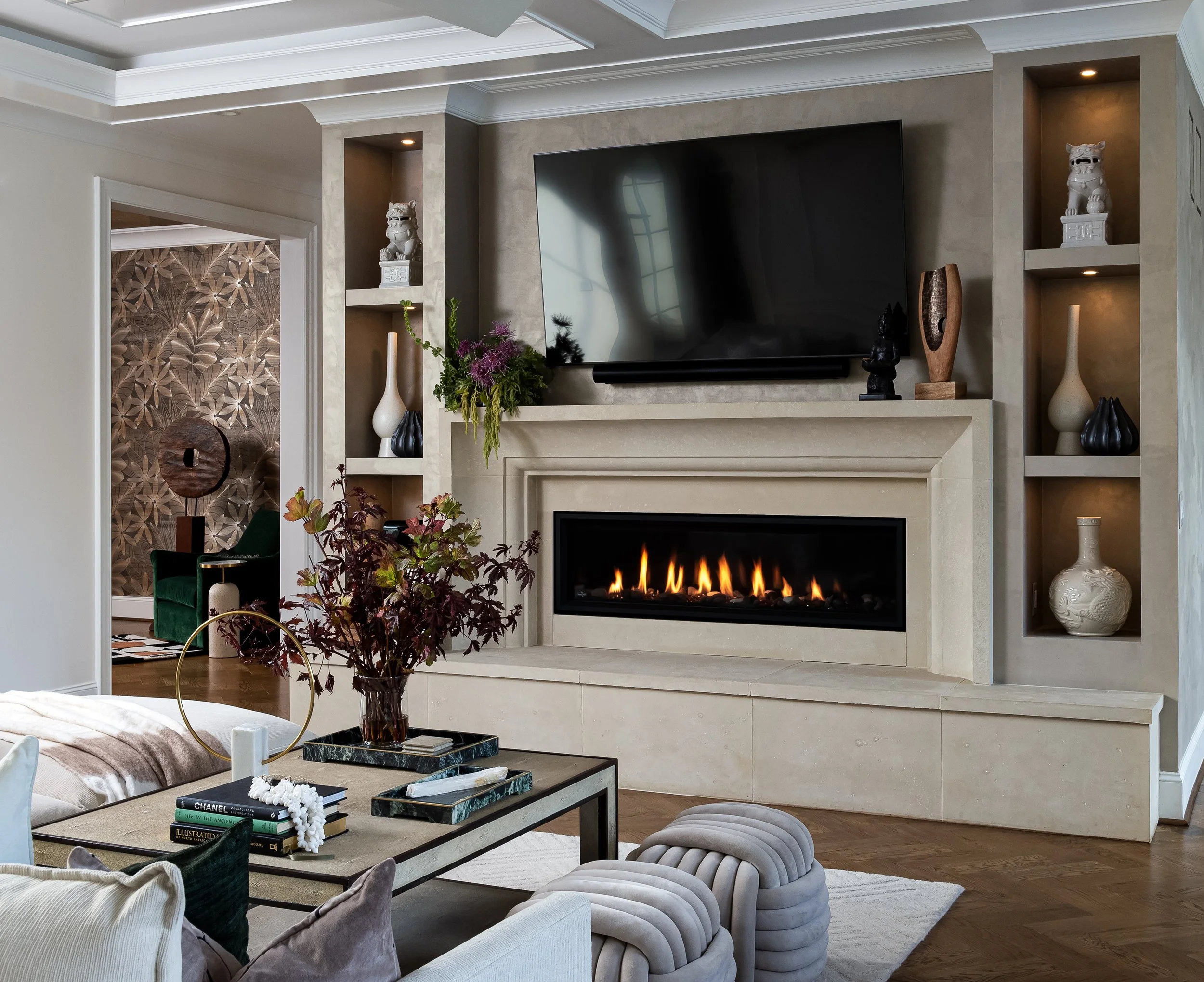 Anchoring the main living space, a hand-detailed fireplace wall commands attention with its rich texture and design-forward presence, bringing both warmth and visual impact. Throughout the home, bold wallcoverings reflect the homeowners' dramatic and elegant taste, adding depth and personality to each space.